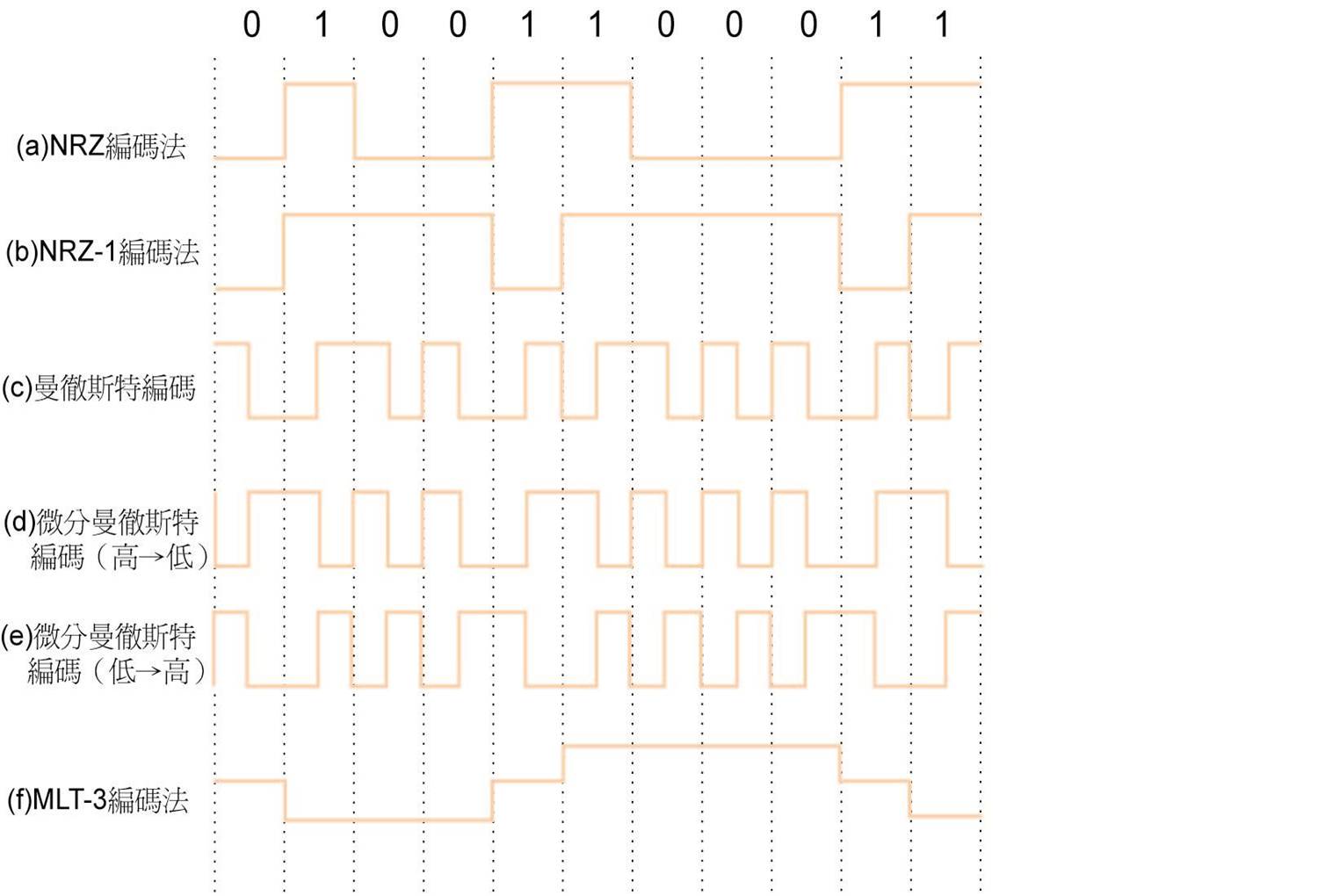 NRZ-1編碼法:遇到1就變而0不變,看圖應該也可以了解